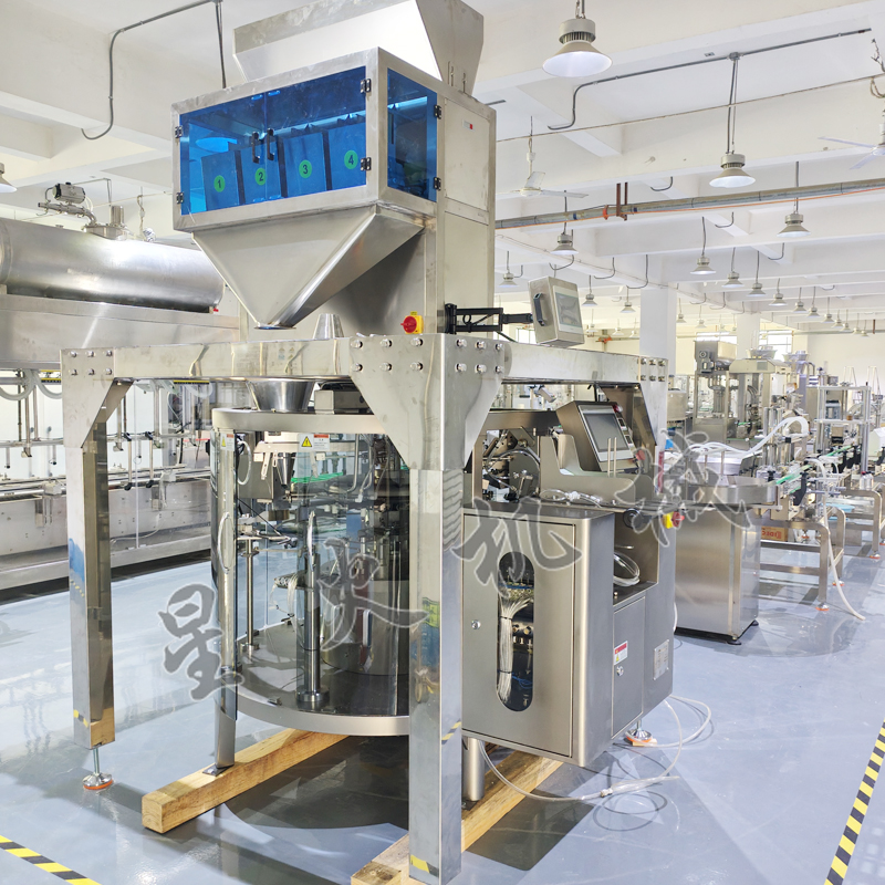 南京星火包裝機(jī)械有限公司推出了一款給袋式顆粒食品包裝機(jī),在機(jī)器頂部采用了一套四斗線性秤對物料進(jìn)行自動(dòng)稱重下料,圓形旋轉(zhuǎn)式八工位給袋裝置,自動(dòng)抓取提前預(yù)備好的預(yù)制袋,并自動(dòng)完成后續(xù)的一系列包裝流程。給袋式顆粒食品包裝機(jī)采用電子秤計(jì)量重量,也可以根據(jù)不同顆粒的特性(如密度、流動(dòng)性、顆粒大小等)和包裝精度要求,靈活選擇合適的計(jì)量方式(電子秤計(jì)量、螺桿計(jì)量、容積杯計(jì)量等多種計(jì)量方式),保證每個(gè)包裝的重量都一致,誤差控制在±0.5%之內(nèi)。整機(jī)結(jié)構(gòu)設(shè)計(jì)合理,配備先進(jìn)的封口裝置,采用熱封、冷封、超聲波封口等多種封口技術(shù),無袋不下料,不開袋不下料,不會浪費(fèi)物料,而且每個(gè)部件的設(shè)計(jì)都協(xié)調(diào)合理,安裝拆洗方便快速??Х榷棺詣?dòng)包裝機(jī)械的應(yīng)用成功的實(shí)現(xiàn)了從自動(dòng)上袋、計(jì)量下料、封口、打碼到成品輸出的全流程自動(dòng)化操作,用包裝機(jī)械代替了絕大部分的人力勞動(dòng),不受人為因素影響,產(chǎn)能保持穩(wěn)定。