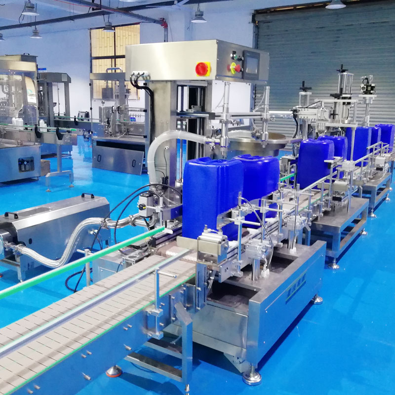 雙頭全自動液體稱重灌裝機采用了聯(lián)動生產(chǎn)線的模式,其中包括:輸送帶、稱重灌裝機、上蓋機、壓蓋機、旋蓋機等自動化設備,它的工作方式較為智能,采用先進的活塞定量原理配合稱重控制技術,能夠完成無人輔助灌裝模式。全自動稱重灌裝機在進入工作模式后,空的大桶容器通過輸送帶將容器輸送至灌裝工位,光電傳感器可以精準確定容器的位置,保證灌裝頭精準的對準容器口此時的劑量泵,經(jīng)過上下運動將液體注入在容器內(nèi),在灌裝過程中稱重感應系統(tǒng)可以實時檢測重量,當達到預設值時系統(tǒng)自動停止灌裝運動。雙頭定量灌裝旋蓋生產(chǎn)線在灌裝完成后,機器將自動進入上蓋、旋蓋的工作模式,確保旋蓋緊密無松動,直至出品輸出。